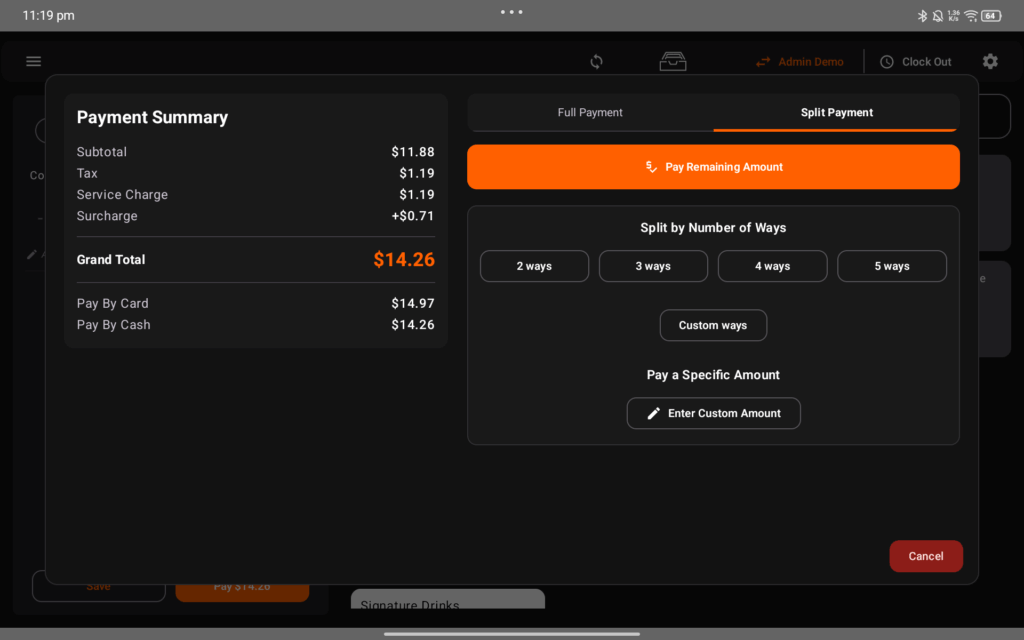 Accept all payment types: card, cash, or split payments